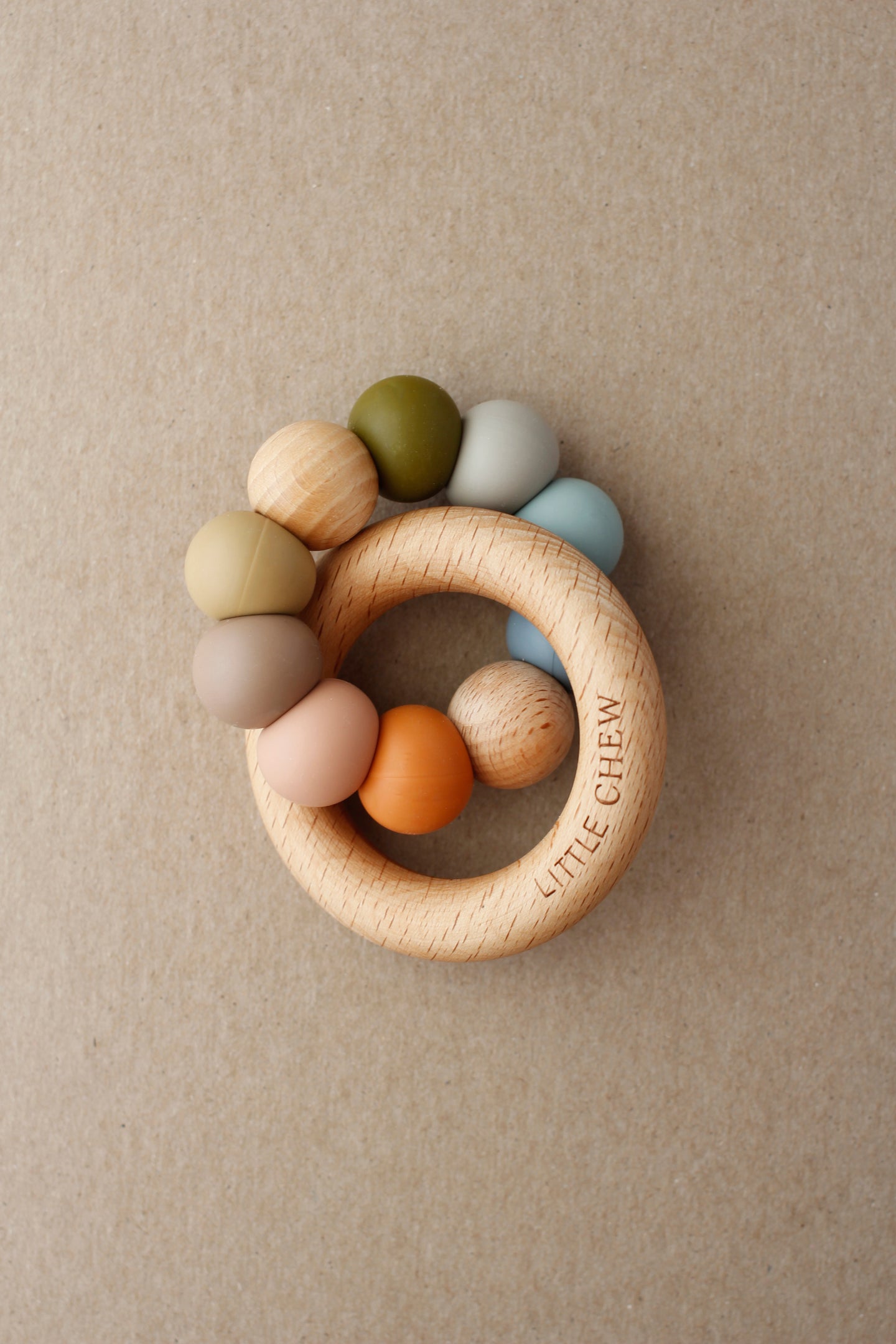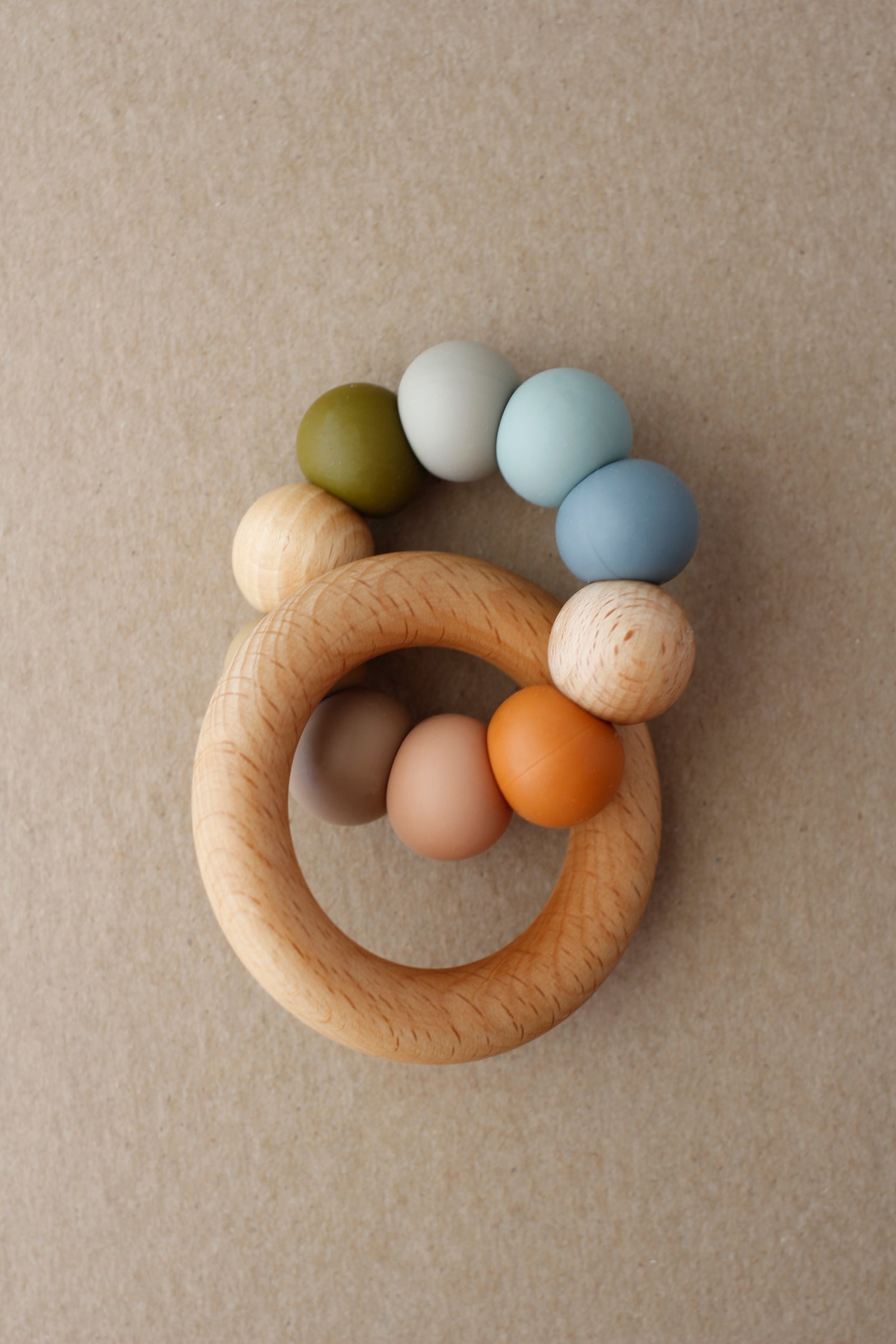 Our Fila teether is a mix of soft silicone and beechwood that have been treated with beeswax. Teether was designed with safety in mind witch will helps to soothe and comfort the baby's tender gums. The simple design is easy for small hands to grab, hold and explore! We recommend treating wood with beeswax or coconut oil for smoothness and longer-lasting!