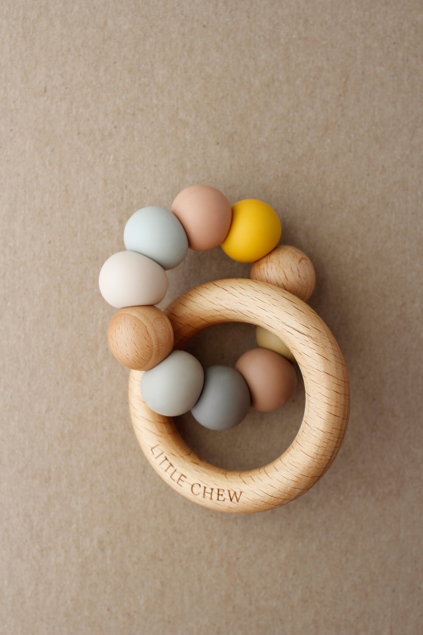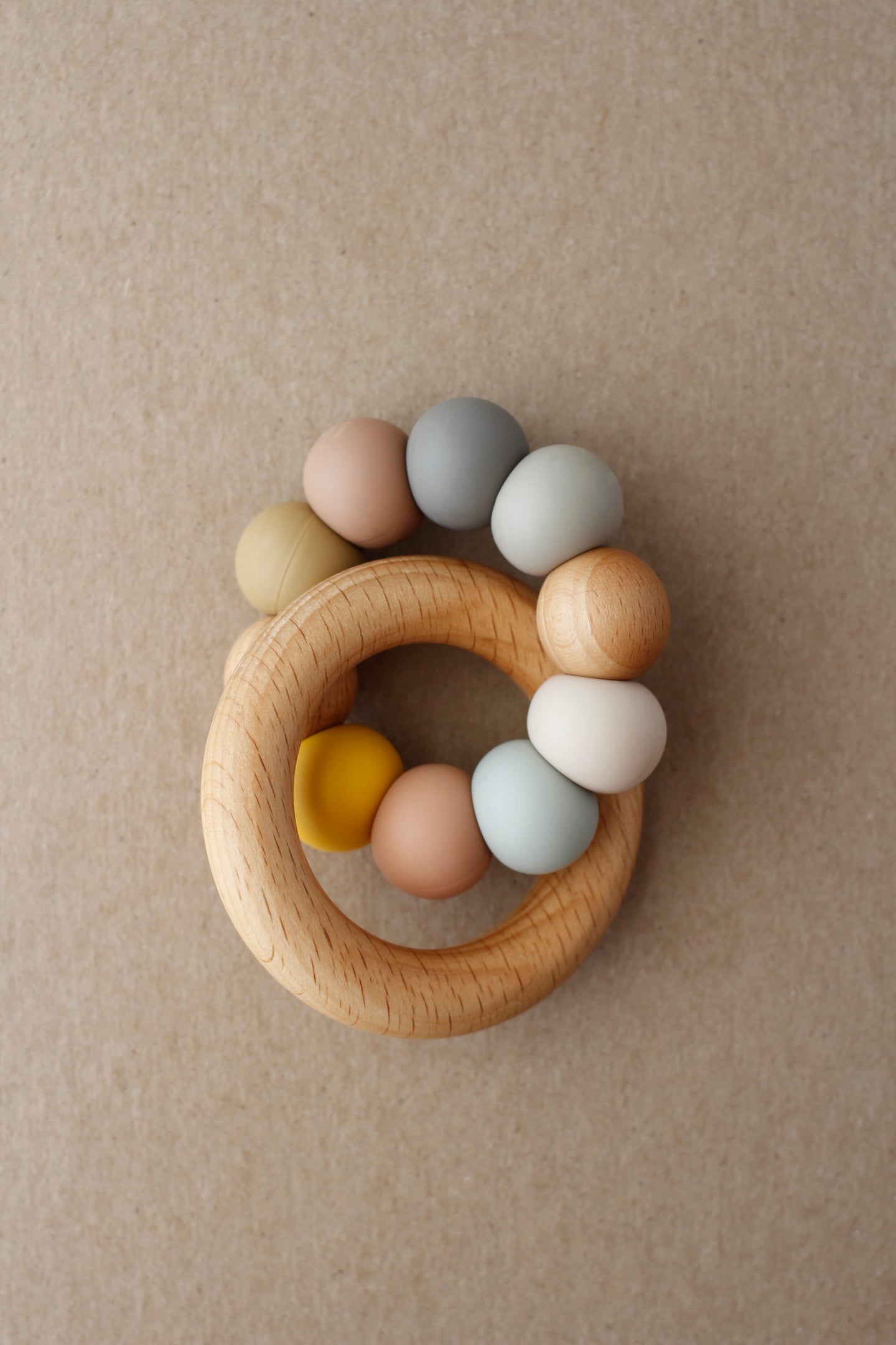 Our Reto teether is a mix of soft silicone and beechwood that have been treated with beeswax. Teether was designed with safety in mind witch will helps to soothe and comfort the baby's tender gums. The simple design is easy for small hands to grab, hold and explore! We recommend treating wood with beeswax or coconut oil for smoothness and longer-lasting!
