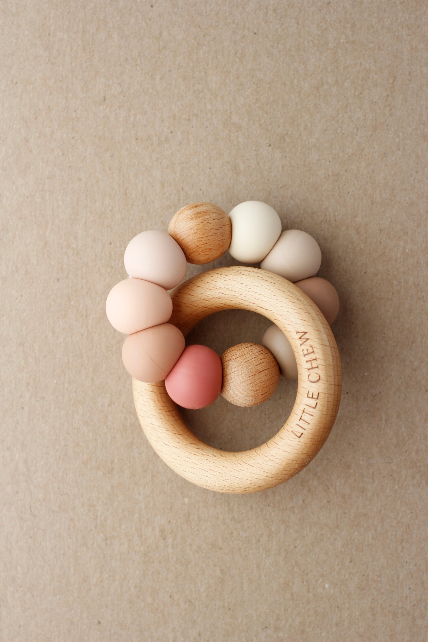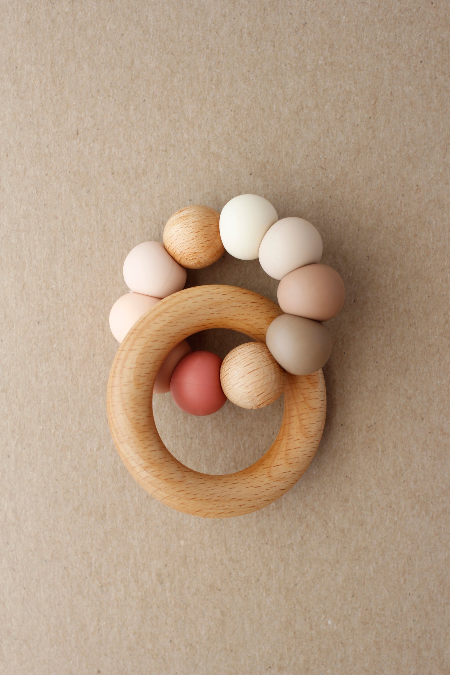 Our Reto teether is a mix of soft silicone and beechwood that have been treated with beeswax. Teether was designed with safety in mind witch will helps to soothe and comfort the baby's tender gums. The simple design is easy for small hands to grab, hold and explore! We recommend treating wood with beeswax or coconut oil for smoothness and longer-lasting!