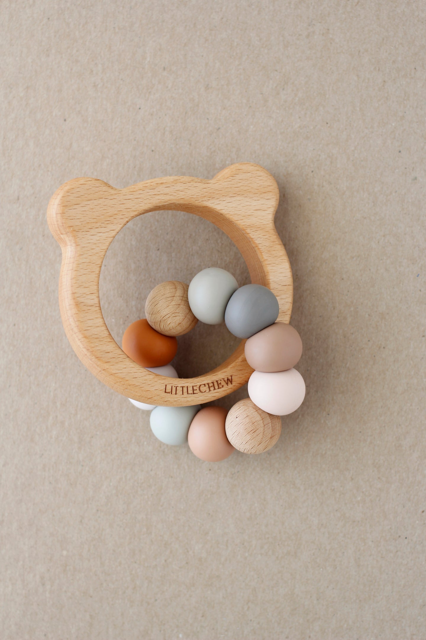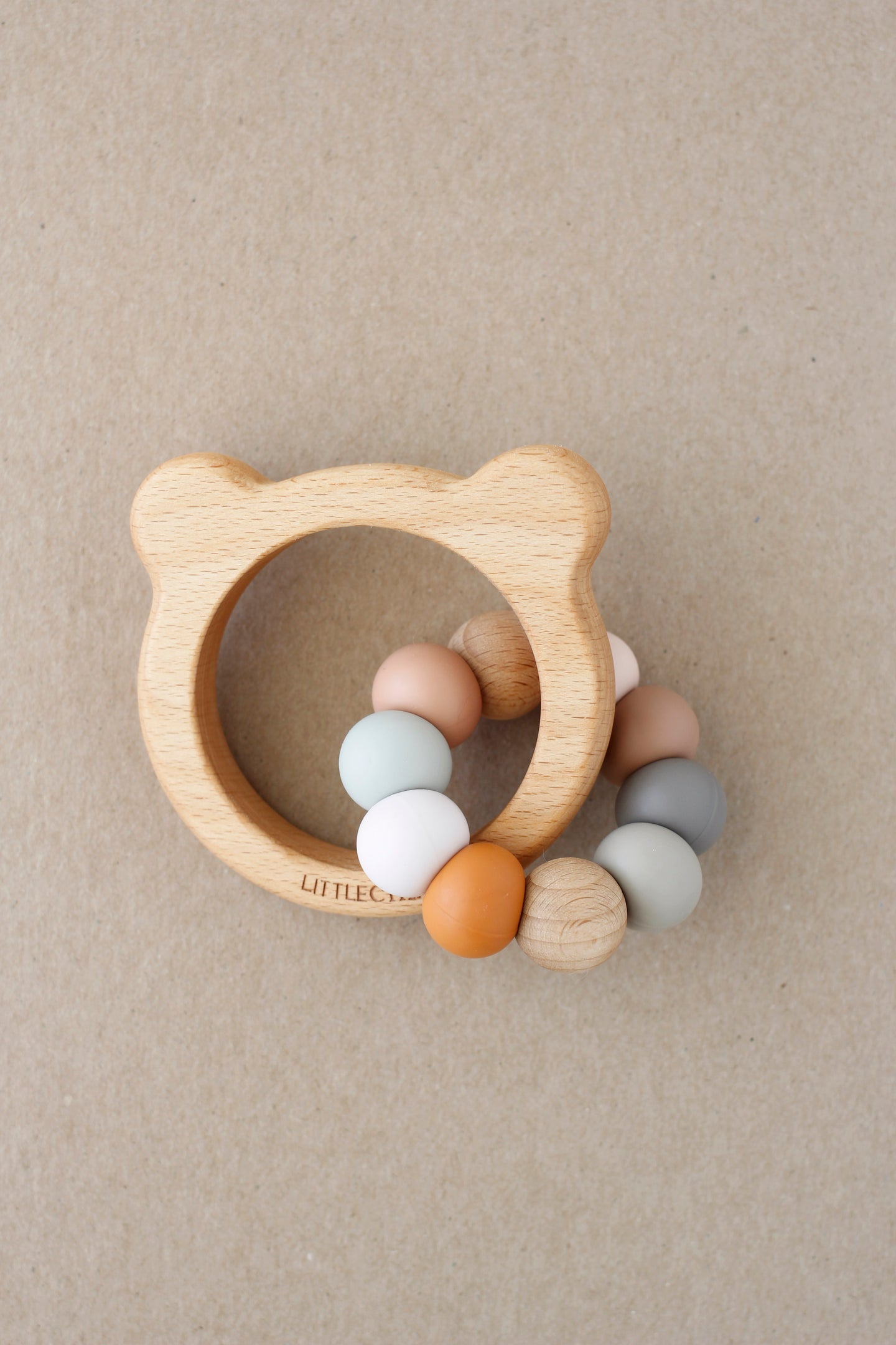 Our Teddy teether is a mix of soft silicone and beechwood that have been treated with beeswax. Teether was designed with safety in mind which will help to soothe and comfort the baby's tender gums. The simple design is easy for small hands to grab, hold and explore! We recommend treating wood with beeswax or coconut oil for smoothness and longer-lasting!